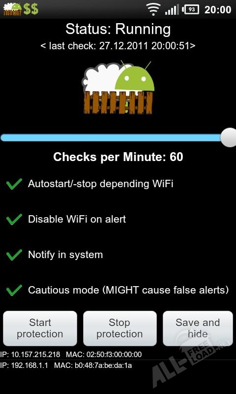 DroidSheep Guard обычно контролирует только МАС-адреса. Для повышения безопасности пользователь может включить режим, в котором приложение будет контролировать еще и IP-адреса, но эта дополнительная страховка может привести в некоторых случаях к ложным срабатываниям. В настройках также можно выставить необходимую частоту проверок. С целью более эффективного выявления атак этот показатель рекомендуют устанавливать в размере 60 проверок в минуту.