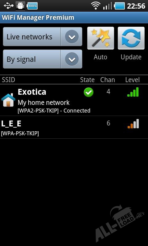 Данное приложение позволяет определять Wi-Fi сеть с самым лучшим показателем сигнала и наивысшей скоростью доступа, что существенно экономит время пользователя. WiFi Manager для Андроид позволяет отображать сети двумя способами, также имеются удобные виджеты. Первый предоставляет детальную информацию о подключении, второй виджет обеспечивает возможность осуществлять целый ряд действий непосредственно с домашнего экрана вашего устройства на базе Android, например, переключение между сетями, производимое простым движением пальца по дисплею. Приложение отличатся функциональностью и способно ощутимо упростить поиск подключений, кроме того, WiFi Manager можно скачать бесплатно. Яркий интерфейс позволяет изменять элементы программы специально под нужды пользователя. Доступны светлая и тёмная темы оформления – каждый пользователь сможет выбрать понравившуюся из них или менять их для разнообразия.