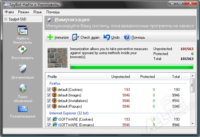 Программа Spybot Search Destroy занимается поиском и уничтожением так называемых рекламных жучков и шпионов. Алгоритм работы программы прост: находя подозрительные элементы и сравнивая их с имеющейся базой нежелательных модулей, программа незамедлительно удаляет их. Если же удаление невозможно, то функционал программы заменяет рекламные баннеры на пустые блоки.