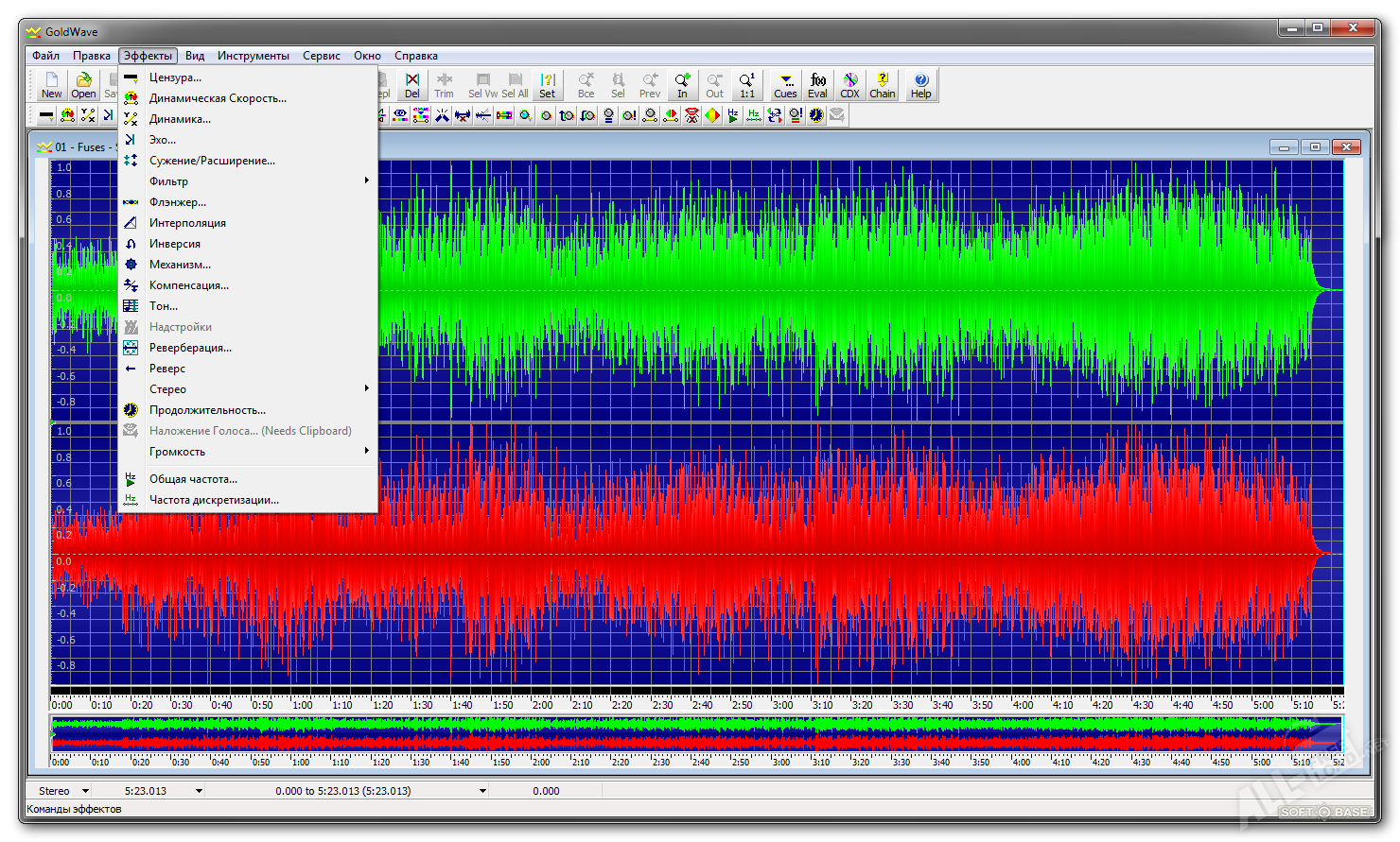 К полученному звуку программа GoldWave может применять большое количество самых разных инструментов. К ним относятся такие стандартные функции, как: разделение, склеивание, разбиение на фрагменты, а также добавление к звуковому ряду различных звуковых эффектов и фильтров. Причём наложение эффектов может происходить не на весь редактируемый файл, а только лишь на ту часть, которая выбирается пользователем. Отличной особенностью GoldWave является редактирование звуковых файлов не просто в визуальном редакторе, а ещё и в режиме реального времени.