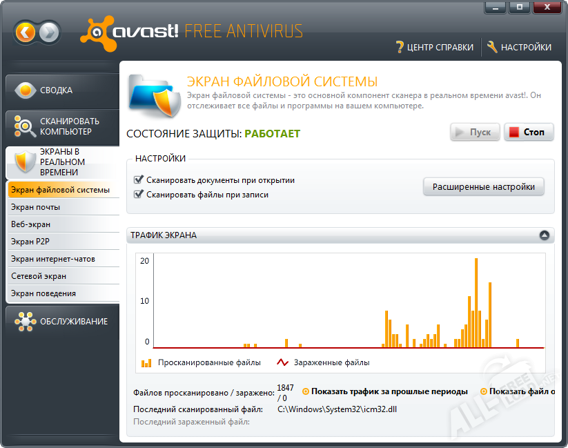 Интересно, что avast free antivirus имеет два вида сканирования. В первом случае пользователь сам выбирает, какие диски и файлы проверять. Кроме того, данный продукт может самостоятельно отслеживать активные приложения и проверять их на вирусы.