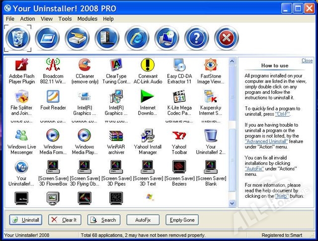 Мы предлагаем надежный деинсталлятор Your Uninstaller скачать бесплатно на собственный персональный компьютер и забыть о любых проблемах с удалением программ. Отметим, что данное программное обеспечение может работать как с 32-битной, так и с 64-битной версией операционной системы Windows. Огромный набор различных инструментов для функционирования позволяют без особых навыков управлять менеджером автозагрузок, удалять следы собственной активности в интернет-сети, а также очищать жесткий диск от всевозможных устаревших программ, документов и прочих файлов.