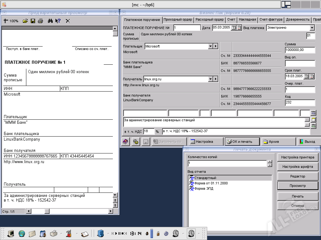 Можно будет так же, при помощи Бизнес пак, создавать справочники, содержащие в себе различные фирмы и товары, что во много раз упростит ведение всех необходимых документов. Для удобства пользователя имеется загрузка документов в базу из файла MS Excel, что будет удобным при переносе, сохранении, а особенно восстановлении всех имеющихся документов. Е если же потребуется внести какие-нибудь изменения в форму любого документа, то в этом поможет редактор отчётов.