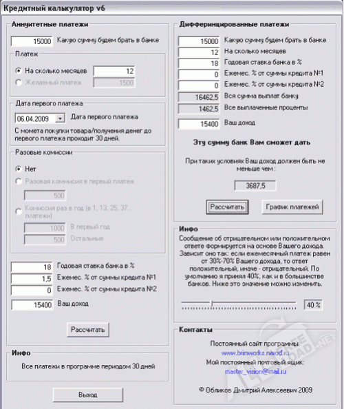 Данный программный продукт дает возможность выполнять финансовые расчеты по кредиту непосредственно на персональном компьютере. При этом, подключение к локальной сети интернет для работы с приложением не требуется. Все расчеты производятся программой в соответствии с дифференцированными и аннуитетными схемами, которые полностью исключают возможность даже минимальной погрешности. Кроме того, что приложение умеет выполнять финансовые расчеты, также имеется возможность определить вероятность одобрения заявки на получение кредита, исходя из указанных данных о доходах и другой персональной информации.
