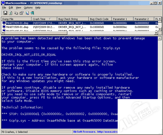 Практически каждый владелец компьютера, хоть один раз в жизни сталкивался с таким неприятным явлением как BSOD или, другими словами, «синий экран смерти». Утилита BlueScreenView, которую можно скачать на нашем сайте, является одной из самых удобных и простых в использовании программ, предназначенных для поиска и анализа причин, вызвавших такую неприятную ошибку. При анализе дампа памяти утилита указывает атрибуты файла, код и параметры ошибки, а также предполагает драйвер, который привел к ее появлению.