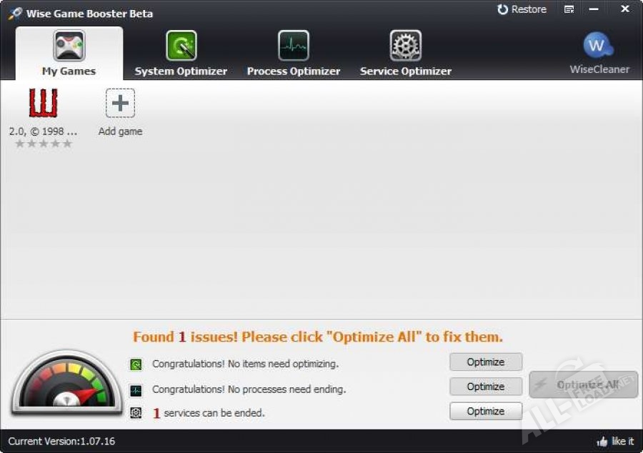 Как работает утилита? Сначала необходимо скачать бесплатно Wise Game Booster на русском и установить, а далее − перезагрузить компьютер. Первый старт программ будет несколько долгим, т.к. будет произведен сбор данных о системе, чтобы ее оптимизировать. Теперь пользователь может кликнуть на «Оптимизировать» или выбрать параметры, которые следует изменить самостоятельно. Русская версия помогает быстрее освоить функциональную часть.