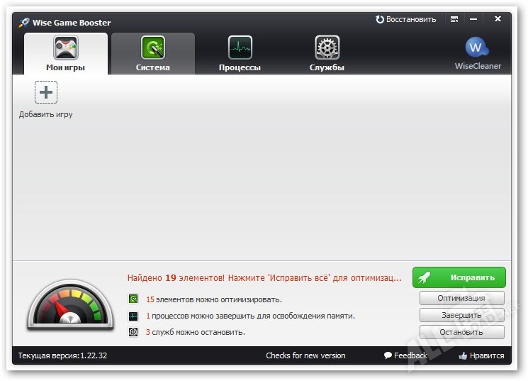 К одним из таких процессов относятся: поиск факса, проверка сертификатов, работа фоновых приложений и т.д. Помимо этих ресурсов, еще оптимизируется сама игра; настройки графики уменьшаются, чтобы не было задержки по кадрам. Убираются ненужные эффекты, многие устанавливаются с меньшим значением. Все это дает возможность быстрее обработать видеокарту и данные процессора. Вот почему удобнее скачать Wise Game Booster и в один клик сделать игру более быстрой, чем вручную закрывать все неиспользуемые потоки. Помимо этого, программа запоминает выбор пользователя, и при работе уже тратится значительно меньше времени.