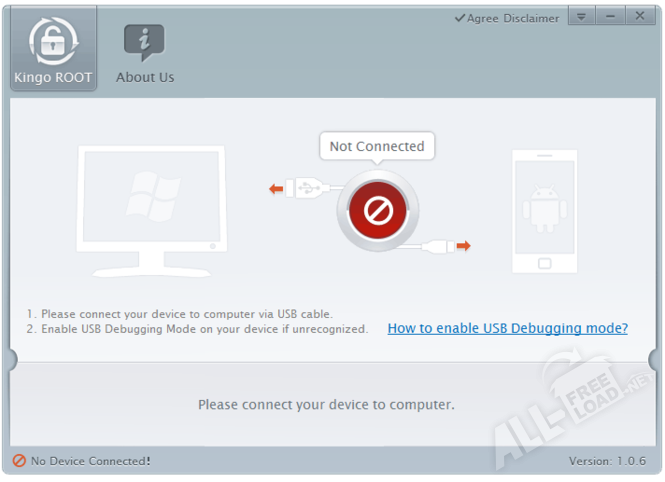 Шаг-6. Подключите свое Android-устройство к компьютеру посредством USB-кабеля и запустите утилиту Kingo Android ROOT.