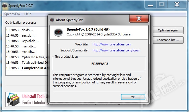Несмотря на то, что по умолчанию данная утилита разработана именно для веб-браузера Mozilla, она отлично справляется с повышением быстродействия и на другом программном обеспечении (например, Skype и Google Chrome). Пользовательский интерфейс приложения отличается простым графическим оформлением и достаточно удобным навигационным меню. Стоит отметить, что в зависимости от размера базы данных SQLite для завершения процесса оптимизации программе может понадобиться некоторое время – обычно это не более одного часа. Чтобы поддерживать быстродействие веб-браузера на должном уровне достаточно запускать оптимизацию не реже двух раз в неделю. Программу SpeedyFox скачать бесплатно можно на нашем популярном интернет-портале по прямой ссылке, которая размещена сразу после описания продукта.