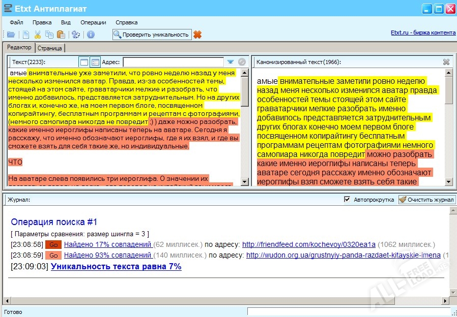Программный продукт Етхт Антиплагиат представляет собой набор мощных инструментов для качественной проверки текстового контента на предмет определения уникальности. Используемые алгоритмы вычислений позволяют получить наиболее достоверные результаты уникальности, в отличие от многих аналогичных программных продуктов. Части текста, которые не соответствуют выставленным в настройках приложения параметрам, выделяются определенным цветом. Кроме этого, в нижней части окна отображается информация об интернет-ресурсах, где и были обнаружены совпадения. Программа Etxt Антиплагиат позволяет осуществлять качественную проверку как отдельных текстов, так и целых веб-сайтов.