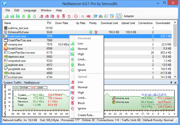 Программа НетБалансер объединяет в себе инструменты, которые позволяют достаточно быстро и без проблем распределить потребляемый трафик между конкретными приложениями. Иными словами, утилита устанавливает ограничение скорости интернет-соединения (как на входящий, так и исходящий пакет данных), а также регулирует выставленные пользователем параметры сетевой активности. При необходимости можно даже заблокировать входящий интернет-трафик в полном объеме. Среди прочих достоинств приложения NetBalancer нужно отметить возможность эффективного управления независимыми процессами и создание подробной статистики. Дополнительно можно получить сведения о скорости интернет-подключения и объеме переданных или полученных данных.