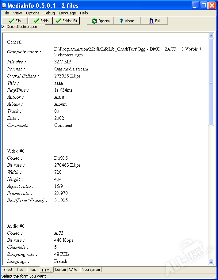 Программный продукт MediaInfo способен предоставить пользователю всю необходимую и полную информацию о имеющихся на персональном компьютере медиа-файлах. В специальное диалоговое окно приложение выводит данные о битрейте файла, количестве кадров, используемом для сжатия кодеке и многие другие полезные сведения. Стоит отметить, что программа МедиаИнфо распространяется как лицензионный продукт с открытым исходным кодом. Среди поддерживаемых форматов медиа-файлов имеются OGG, DivX, MPEG-1 и, конечно же, MP3 цифровой формат. Приложение также способно эффективно работать с различными субтитрами, в числе которых стоит отметить SAMI и SRT.
