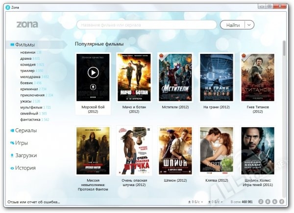 Zona – это программа, которая представляет собой оригинальный и несколько своеобразный торрент-клиент. При этом, обладая всем стандартным функционалом торрент-клиен – докачкой раздачи, магнитными ссылками, приоритетом и ограничением скорости загрузок, просмотром информации о раздающих, работой в фоновом режиме и многими другими возможностями, присущими подобным программам. Основной особенностью утилиты Zona является то, что этот клиент представляет собой полноценный торрент-трекер для скачивания различного развлекательного контента в виде фильмов, сериалов и музыки.