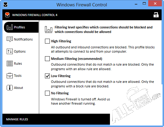 Желающие иметь простой в работе продукт могут Windows Firewall Control скачать бесплатно. Дистрибутив новой версии занимает до 30 Мб. После установки приложение находит межсетевой экран Windows и больше не требует вмешательства пользователя. Возможна также дополнительная настройка и разграничение полномочий стандартных средств ОС и антивирусной утилиты. Такой режим полезен при начальной проверке активности сетевых процессов или для изменения параметров сторонних программ.