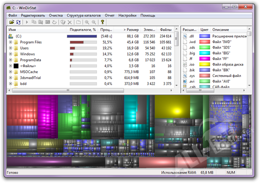 WinDirStat – это мощная утилита, обладающая открытым кодом, которая выполняет подробный анализ дискового пространства у любого привода, работающего в системе. Это приложение помогает пользователю наглядно увидеть подробную картину использования памяти. Для этого будет необходимо выбрать нужный диск или директорию, после чего WinDirStat предоставит визуальную информацию об имеющихся файлах. Для большего удобства каждый элемент, будет окрашен в свой собственный цвет, который будет зависеть от объёма занимаемого пространства на носителе. Такой подход даст возможность легко оценить то, что какие именно типы файлов занимают в памяти больше всего места. Например, по умолчанию, те файлы, которые занимают наибольшее место, окрашиваются в светло-синий цвет.