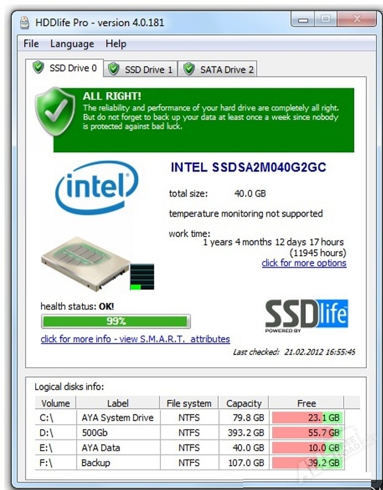 Если говорить о функциональных возможностях программы, то с помощью HDDlife Pro можно контролировать производительность жесткого диска, заблаговременно получать сообщение о возможных проблемах, проверять накопители на наличие ошибок и сбоев, постоянно контролировать свободное место, а также следить за температурой любого из накопителей. Другими словами, если HDDlife Pro скачать на русском, можно умело управляться со всеми жесткими дисками, которые стоят на персональном компьютере. Для того чтобы описать все возможности приложения потребуется много времени, а наша задача сжато представить все, что умеет эта программа.