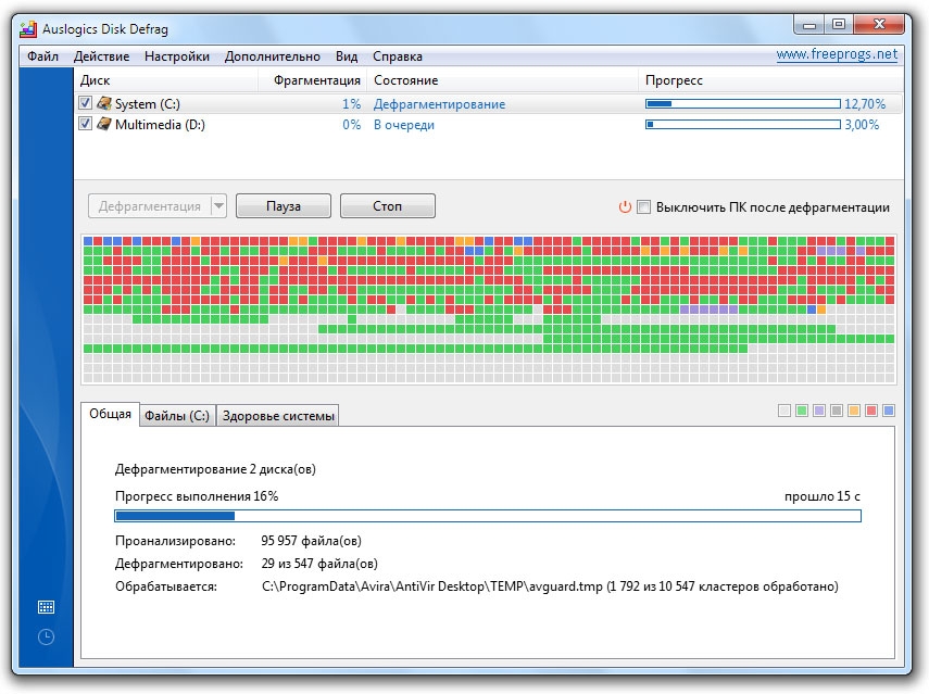 Автоматический режим работы Auslogics disk defrag использует период, когда система бездействует, и запускает процесс дефрагментации, не мешая работе других приложений.