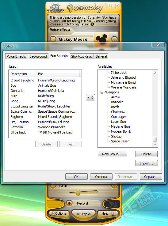 Программа позволяет наложить эффект на свой голос. Количество встроенных эффектов довольно велико, можно импортировать собственные. Обработка голоса — не единственная причина если скачать программу Scramby. В ней присутствует библиотека забавных звуков, которые можно использовать одним щелчком мыши. Вставленные в нужный момент, они наверняка скрасят разговор. Присутствует инструмент для воспроизведения звуков окружения. С их помощью можно создать впечатление, что вы посреди леса, в ночном клубе или на берегу океана. Скрамби может записать полученный разговор.