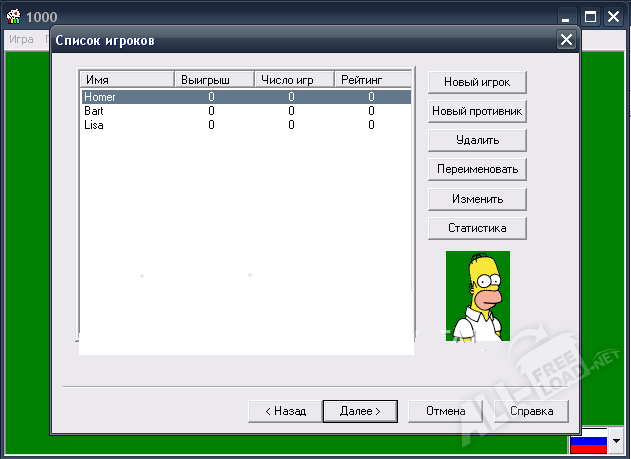 В игре принимают участие четыре человека. Если у вас нет партнеров, а очень нравится игра 1000, скачать бесплатно ее можно на компьютер и играть с виртуальными партнерами, которых вам предложит программа.
