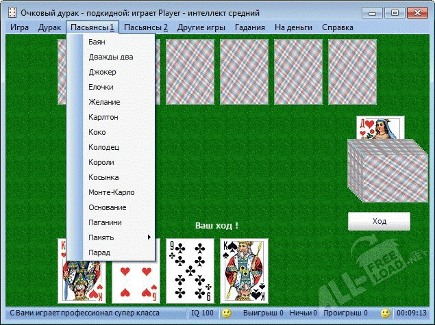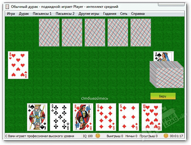В этой карточной игре победителей нет – кто сумел избавиться от своих карт, тот и победитель, а вот проигравший есть – тот, кому не удалось сбросить все свои карты. Играть могут от двух до шести человек, а если играть не с кем, можно игру скачать бесплатно на компьютер и рассматривать его как соперника. Играть против компьютера сложно – он ошибок не допускает и может считаться умнейшим из соперников. Впрочем, есть версии, позволяющие настроить уровень сложности, и первое время наслаждаться победами, а когда легкие выигрыши наскучат, заставить компьютер играть сильнее.