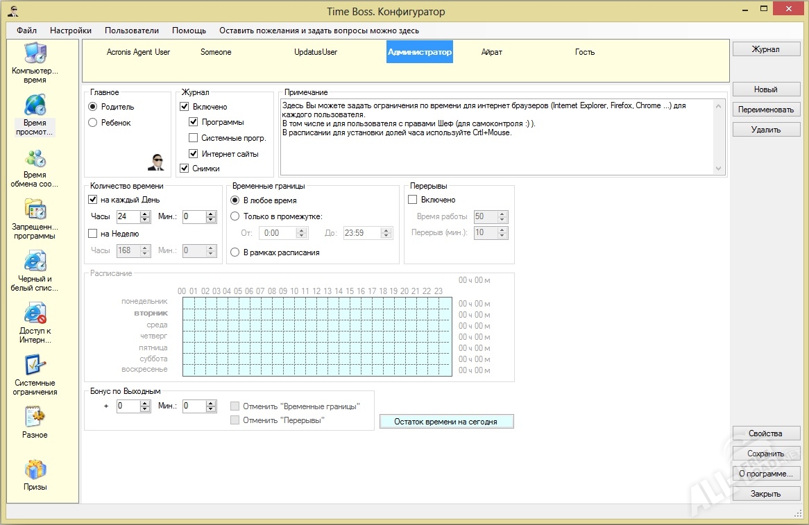 Помимо всего прочего, с помощью данной утилиты пользователь может лично создавать профили доступа и управлять ими, в том числе и удаленно. При пользовании компьютером сторонними лицами программа Time Boss автоматически будет блокировать доступ к приложениям и веб-сайтам, которые были отмечены в настройках. Также имеется возможность установки временных ограничений работы установленных на компьютере программ и операционной системы. Такие лимиты можно устанавливать согласно внутреннему расписанию на каждый день или несколько раз в течение недели. Кроме ведения журнала событий, приложение обладает инструментами для создания скриншот-логов. Программу Time Boss скачать бесплатно можно на нашем портале по ссылке, которая доступна после описания.