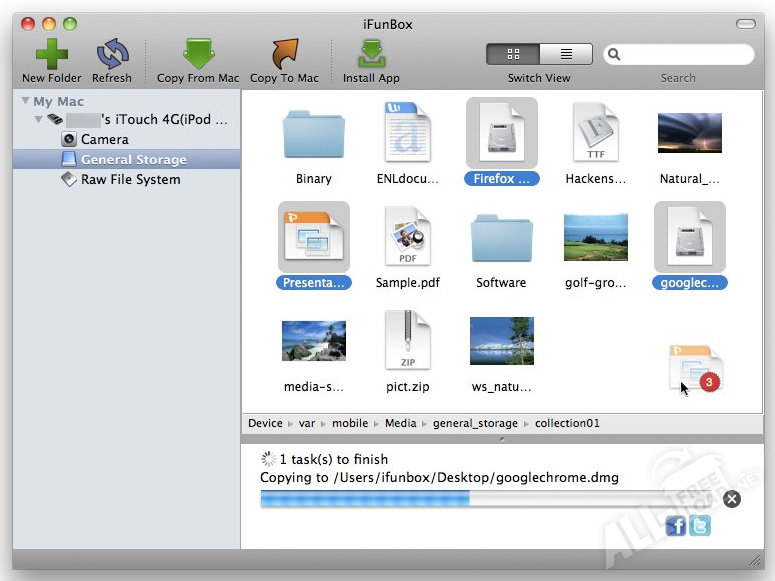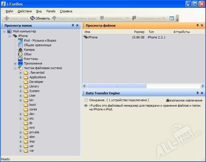 iFunBox — это файловый диспетчер для устройств iPopTouch и iPad с помощью которого можно открывать документы с устройств компании Apple так, как будто это дополнительный внешний накопитель. Вам нужно только скачать iFunBox на русском на компьютер, подключить iPhone/ iPodTouch к ПК и запустить приложение, после чего программа проанализирует данные на подключенном накопителе и отобразит их в специальном интерфейсе с двумя панелями. В их левой части будет отображаться дерево файлов, а в правой — документы, которые находятся в текущей папке. Этой информации достаточно для того чтобы разобраться как пользоваться приложением.