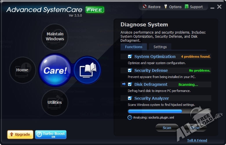 После нажатия кнопки «Care!» программа проведет анализ вашей операционной системы и сделает некоторые исправления. Она изменит настройки безопасности на оптимальные, очистит рекламное и шпионское ПО с дисков, найдет и исправит ошибки в системном реестре, появляющиеся вследствие некорректного удаления программ, очистит временные файлы и историю браузеров. Таким образом, Advanced SystemCare Free оптимизирует работу системы, значительно уменьшив время ее загрузки и улучшив производительность приложений.