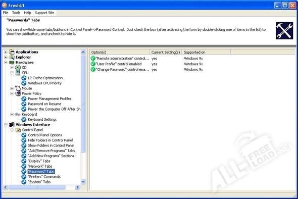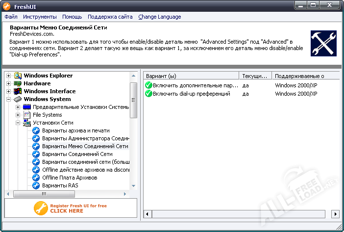 Следует обратить внимание на то, что пункты утилиты, которые не соответствуют вашей версии ОС, установленной на компьютере, не будут доступны. К примеру, те настройки, которые подходят для XP, нельзя будет применить к 98 и наоборот. Fresh UI обладает понятным интуитивно и не перегруженным лишними деталями интерфейсом. Пользовательское меню состоит из двух панелей. Есть руководство по использованию и встроенная справочная система.