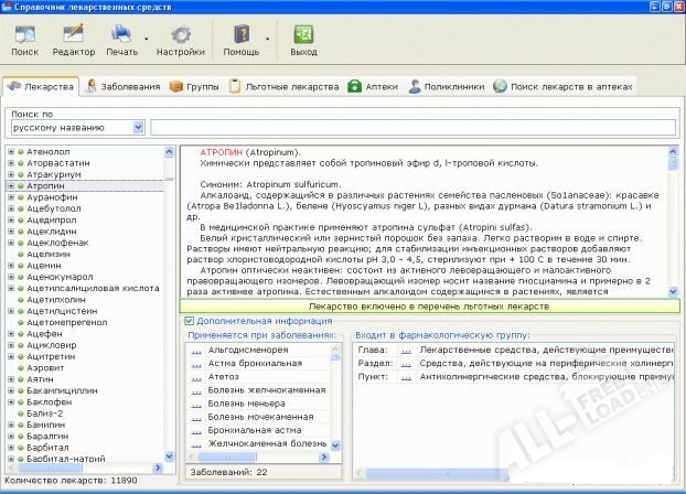 Справочник лекарственных средств — это перечень полезной информации, по огромному количеству различных препаратов и средств. В данном справочнике находится более 10 000 различных средств, находить которые можно благодаря синонимам названий. При помощи представленного приложения у Вас будет возможность отыскать наиболее подходящее лекарственное средство для того чтобы лечить то или иное заболевание. В представленной базе лекарство подробно описывается более 430 различных болезней. Помимо всего этого отметим, что если скачать справочник лекарственных средств, то можно найти информацию о перечне льготных препаратов, которые утверждены минздравом.