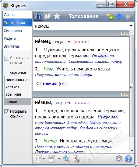 Вы наверняка согласитесь, что программа Rhymes, которая состоит из нескольких современных словарей и отличается большим количеством функций чрезвычайно удобна и полезна. Если ее еще нет на Вашем ПК, то обязательно уделите некоторое время на ее скачивание, Вы об этом никогда не пожалеете!