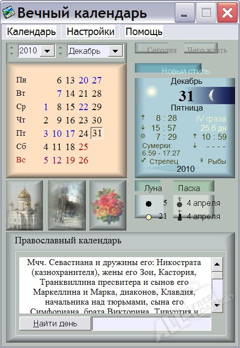 «Вечный календарь» — это специализированная программа, которая может похвастаться широчайшим функционалом. Благодаря встроенному алгоритму, все кто скачал и установил данное приложение себе на персональный компьютер получить абсолютно любую статистическую информацию о том или ином дне. Только представьте себе, Вы сможете изучить весь григорианский или юлианский календарь с 1 по 3 000 год нашей эры. Для того чтобы Вам было проще и легче работать с приложением, его разработчики позаботились о довольно удобном и самое главное интуитивном интерфейсе. Именно благодаря этой особенности перед человеком открывается возможность получать нужную информацию максимально быстро.