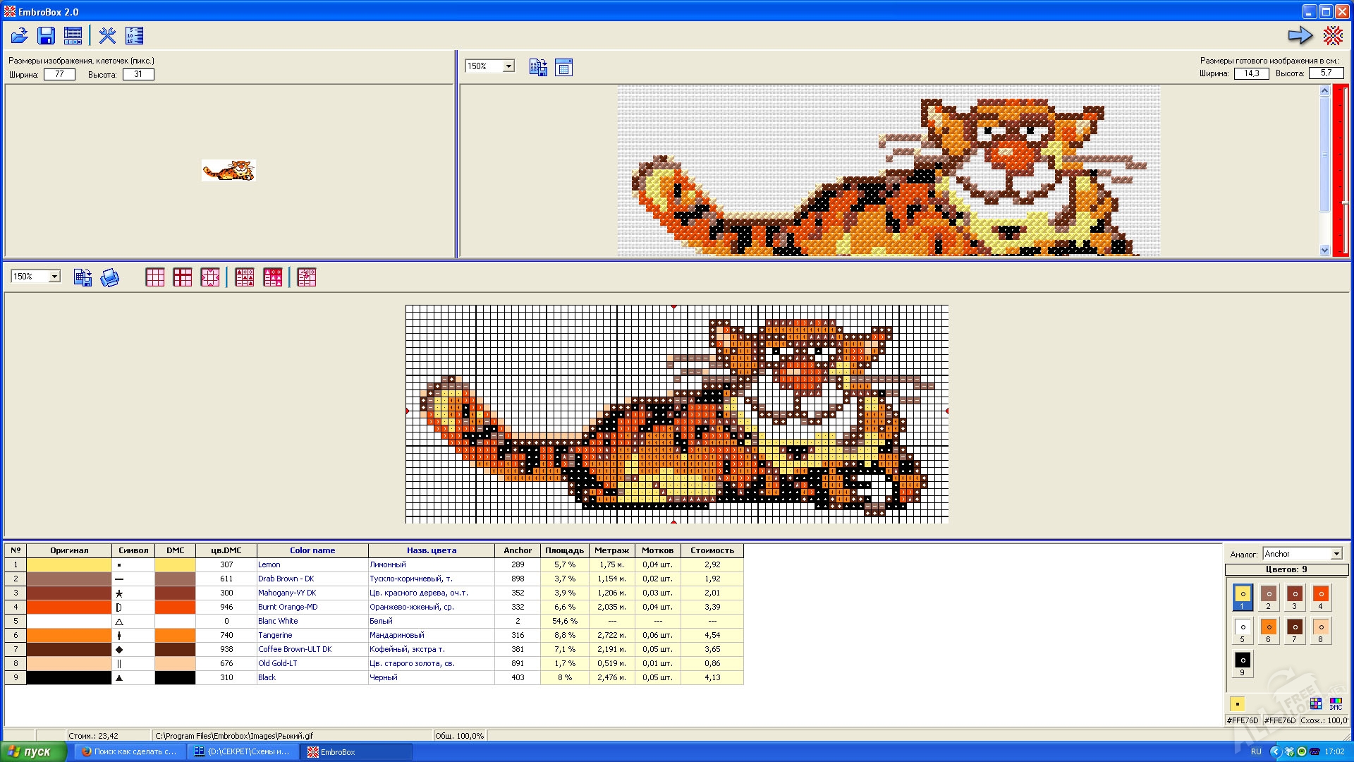 Программа EmbroBox предлагает пересмотреть схему – демонстрируется приблизительный вариант готовой вышивки и размер в сантиметрах. Дальше создается схема, на которой цвета обозначены специальными символами. Если для рисунка не нужен фон, он может быть прозрачным. Программа для вышивания генерируют схему в одном из вариантов отображения: с метками по центру, с сеткой или разноцветными ячейками. Схему можно масштабировать.