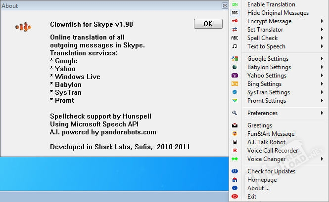 Пользователи могут скачать Клоун Фиш для Скайп и пользоваться такими дополнительными возможностями, как проверка правописания, проигрывание музыки во время голосового сообщения, шифрование сообщений, поздравительные открытки и запись разговоров.