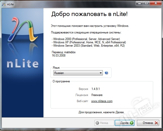 Официальная версия Nlite предоставляет широкие возможности для усовершенствования компьютера. Главное достоинство программы - параметры настроек для создания дистрибутива на русском языке, что значительно упрощает работу пользователям.