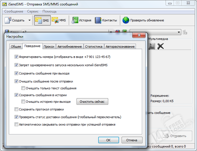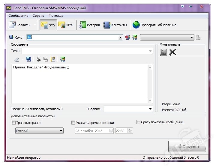 Существует ещё несколько возможностей программы. Мультимедийные сообщения (MMS) будут также отправляться свободно, если эта услуга поддерживается оператором. При этом работать iSendSMS будет как через прямое подключение к Интернету, так и через прокси-сервер, что позволит пользоваться приложением не только дома, но и на работе. Также стоит отметить, что iSendSMS скачать бесплатно может любой пользователь. А интерфейс программы, кроме того, что он является удобным и русскоязычным, что создаёт дополнительный комфорт для любого пользователя.