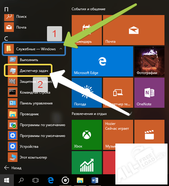 Необходимо открыть меню пуска, далее найти вкладку Служебные, и в ней будет диспетчер.