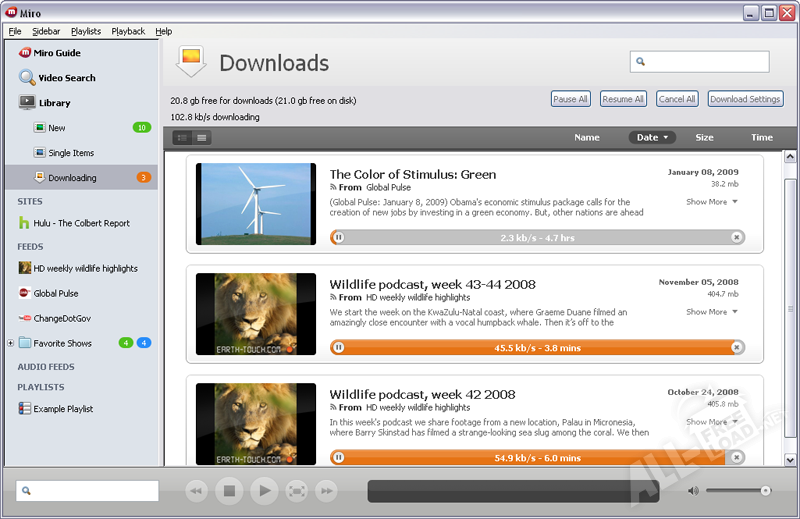 Достаточно компактный медиа-плеер Миро предназначен для воспроизведения HD видеороликов и обеспечивает полноэкранный просмотр без потери качества. Помимо этой функции, приложение позволяет использовать обширную базу данных для поиска нужной видеозаписи и загружать файлы на персональный компьютер. Встроенная библиотека телевизионных передач насчитывает порядка шести тысяч бесплатных каналов. Программа Miro поддерживает работу с множеством цифровых форматов, включая WMV, XviD, MPEG и другие. Загружать видеофайлы можно с таких популярных хостингов, как Revver, YouTube, BlogDigger и других аналогичных сервисов хранения мультимедийного контента.