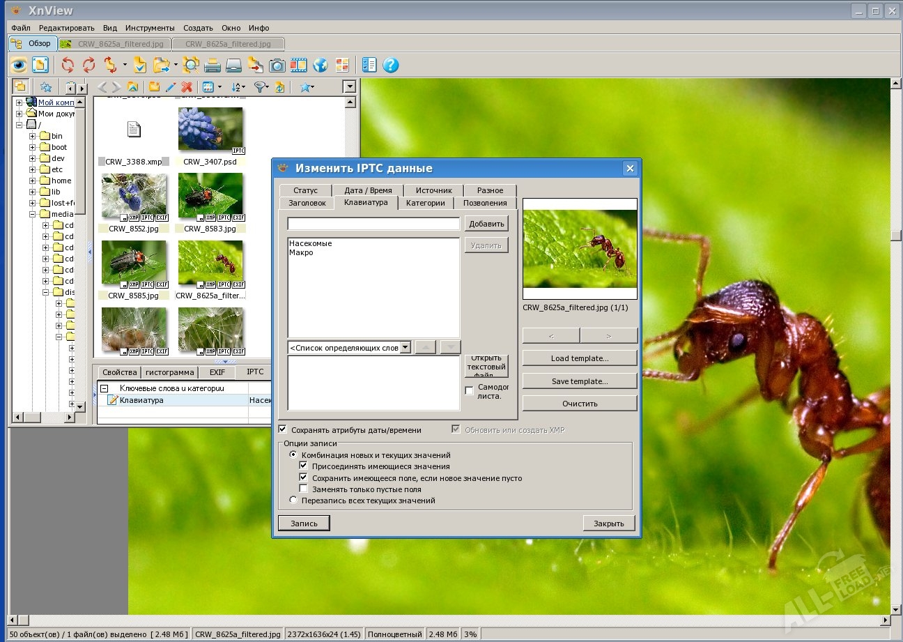 - Поддержка записи метаданных EXIF и IPTC;