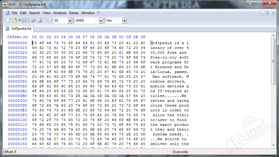 HxD — один из лучших редакторов, работающих с шестнадцатеричным кодом. Функциональные возможности программы позволяют за считанные секунды находить и изменять нужные фрагменты. HxD можно пользоваться в тех случаях, когда есть необходимость отредактировать бинарные файлы. Например, редактор будет полезен тем, кто работает с модификациями оперативной памяти. Утилита поможет найти нужный фрагмент, а после — изменить его. Это же касается и RAW-дисков, и некоторых процессов. Особенность HxD в том, что открытые в нём файлы представляют собой лишь набор байтов. Такой низкоуровневый доступ нужен лишь специалистам, занимающимся разработкой программного обеспечения.