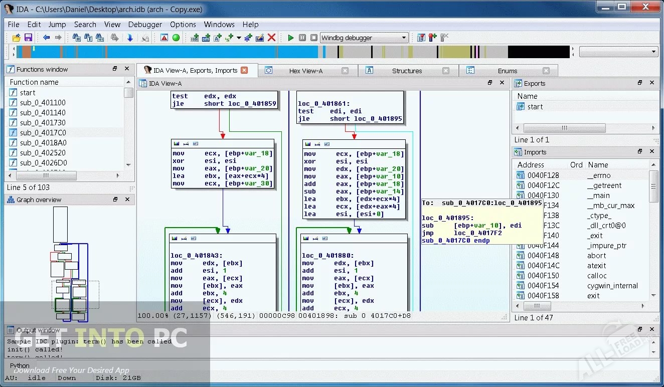 Также можно задать и привязку (к примеру, открывать файлы данного формата именно через эту программу в Виндовс).Удобнее только скачать IDAPro и выполнять процесс дизассемблирования, чем компилировать данные через несколько приложений. Сохраняются все пользовательские настройки. В рабочей среде уже есть готовые шаблоны, которые можно изменить, удалить или создать новые. Это повышает комфорт использования продукта в целом. Последние действия можно отменить, используя навигацию или стандартную комбинацию клавиш.