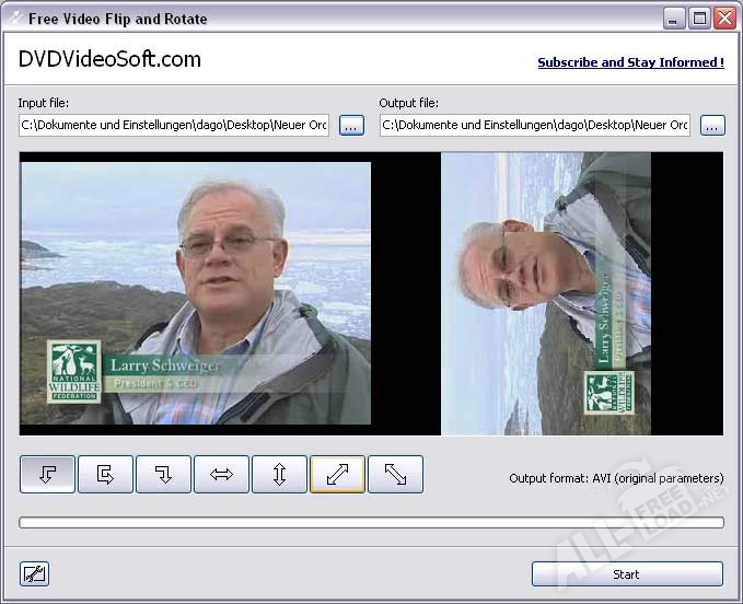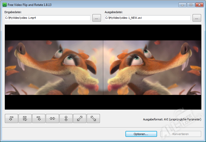 При помощи весьма удобной программы Free Video Flip and Rotate можно создавать зеркальные версии различных видеозаписей. Помимо этого, приложение позволяет вращать видеоизображение на 180 градусов. Повороты видео можно осуществлять как против, так и по часовой стрелке. Стоит отметить, что утилита Фри Видео Флип энд Ротейт способна выполнять семь различных операций по обработке видеофайлов. При выборе конкретного действия отображается кнопка с картинкой, которая соответствует намеченной операции. Программа Free Video Flip and Rotate позволяет выполнить как вертикальное, так и горизонтальное отражение видеозаписи с поворотом на 90 градусов.