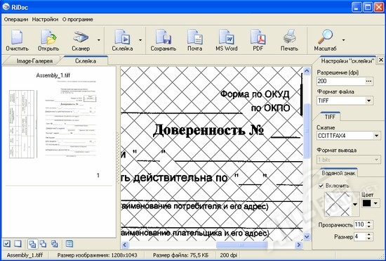 Интерфейс RiDoc простой и интуитивно понятный, работать с утилитой несложно. Утилита приспособлена для работы со сканерами, обладающими функцией автоматической подачи листов. Отсканированные изображения сохраняются в нескольких популярных форматах. Программа позволяет менять разрешение файла, а также производить другие настройки. Кроме этого, есть возможность сохранения изображений в виде файла PDF и в файл Word. При необходимости на изображение накладываются водяные знаки. Полученные в результате сканирования файлы можно сохранить при помощи «Быстрых папок». Программа позволяет отправить полученную электронную версию документа по электронной почте, а также сохранить все варианты документов в один общий файл.