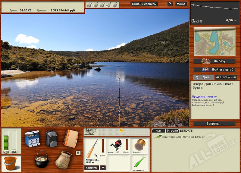 Любителю уединения в процессе рыбалки достаточно скачать Русскую рыбалку на компьютер и наслаждаться одиночеством. Если же вы любите компанию, радостью от пойманного трофея заходите с друзьями поделиться, побеседовать о результатах рыбалки и просто вступить в общение с людьми, близкими вам по духу, можно использовать режим он-лайн, и все, кто в данный момент играют в эту игру, составят вам компанию. Для этого необходимо только зарегистрироваться. Имейте в виду, что эту игру можно скачать бесплатно.