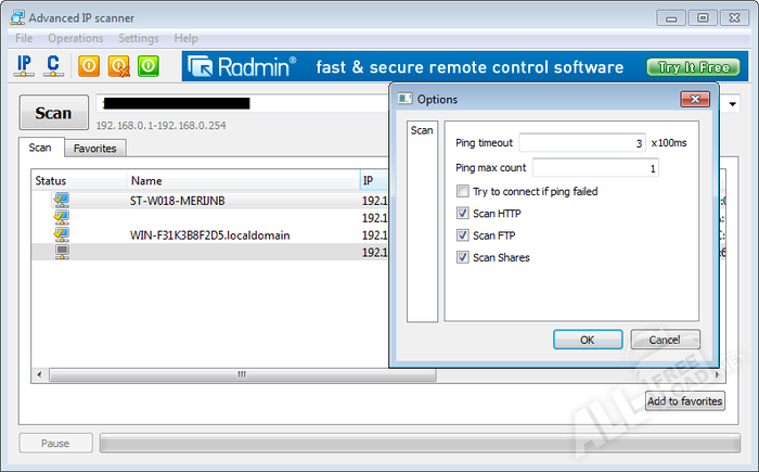Advanced IP Scanner — приложение, сканирующее сетевые IP для Windows. Программа ищет устройства в сети, соединяющей компьютеры, и проверяет их порты. Утилита дает возможность осуществить доступ к разным документам машин, которые находятся в сети. Это могут быть общие файлы, HTTP и FTP. Программа Advanced IP Scanner обеспечивает пользователя информацией о всех устройствах, входящих в локальную сеть: именами компьютеров, компаний-изготовителей карт для сети, IP адресами.