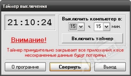 «Таймер выключения» — достаточно небольшая, но чрезвычайно полезная программа, благодаря которой можно заметным образом автоматизировать свою собственную работу на персональном компьютере. Как Вы наверняка догадались, речь идет о выключении компьютере в установленное пользователем время. Также среди основных возможностей приложения выключение и перезагрузка ПК через какой-то определенный срок или же запланированная блокировка. Хотите автоматизировать рабочий процесс? Обязательно воспользуйтесь предложенным нами приложением.