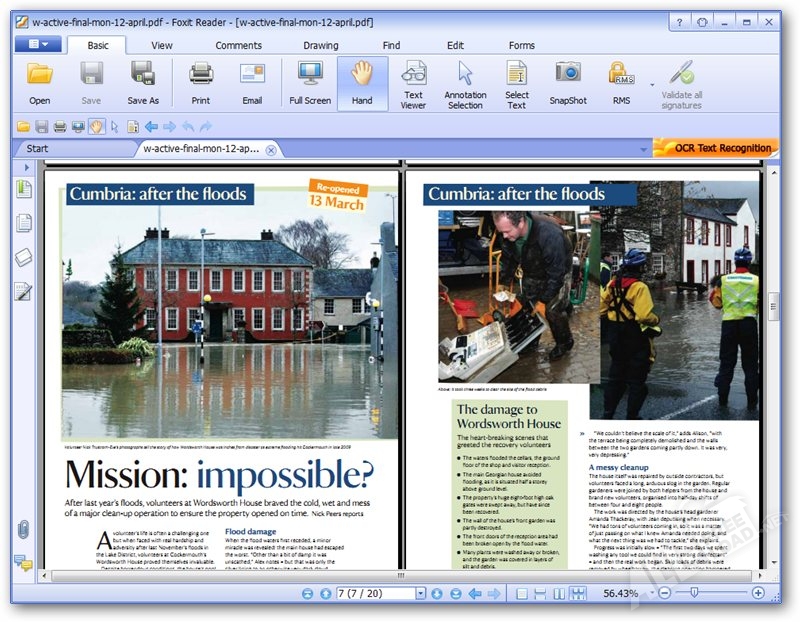 Используя данную программу, пользователь может просматривать фотографии, читать журналы и книги, предлагаемые Сетью или сохраняемые на ПК. В Foxit Reader присутствует функция добавления аннотации и обмена информацией о документе в популярных социальных сетях. Очень полезной является возможность использования лупы – она позволяет уменьшать или же увеличивать документ до 6400 %. Программа имеет связь с принтером, поэтому предлагает возможность распечатывать как целые документы, так и фрагменты.