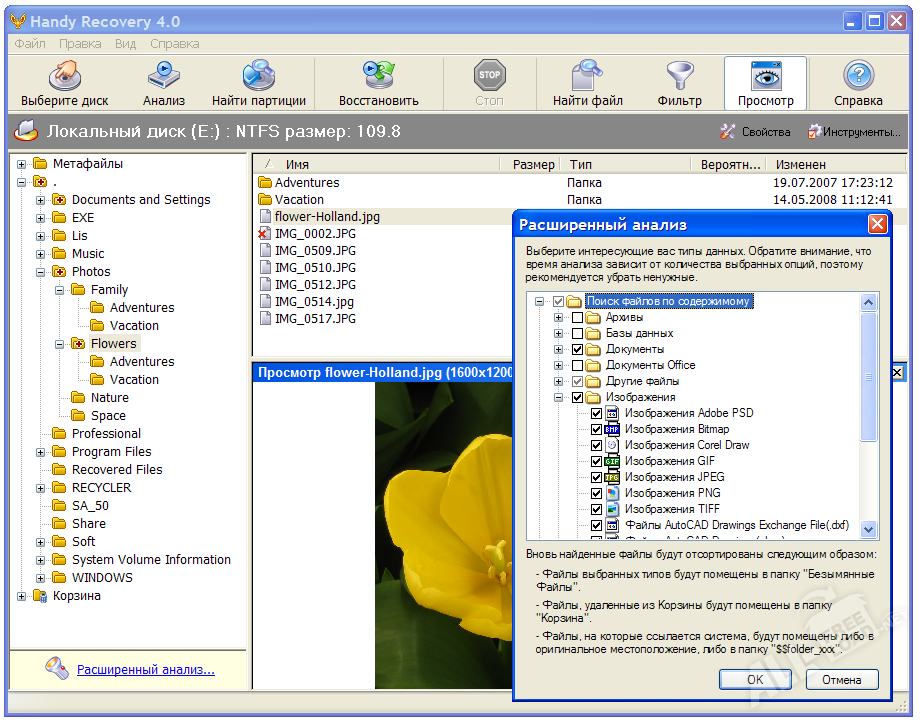 Программа способна восстановить файлы, помещенные в «корзину», даже после ее очистки. Если же файлы были удалены без использования «корзины», Handy Recovery также справится с задачей их восстановления. Утилита производит восстановление утраченных данных с разделов, которые были повреждены либо удалены.
