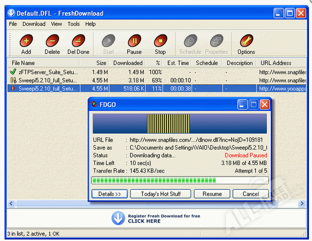 Программа хорошо интегрируется с браузером Internet Explorer, Netscape, Mozilla Firefox, Opera и другими. Во время закачки файлов из глобальной сети отображается скорость, время скачивания и эффективность использования линии соединения. Программа поддерживает звуковые сигналы в качестве оповещения, а также функцию выключения компьютера после окончания закачек. Fresh Download работает с ZIP архивами, позволяет пользователю задавать прокси-серверы HTTP и FTP. Одним из дополнительных элементов защиты от вирусов является список исключенных web-адресов, которые можно указывать в программе. Любой пользователь может Fresh Download скачать бесплатно, однако программа требует регистрации на официальном сайте производителя. Пользователь указывает адрес своей электронной почты, на которую приходит ключ для активации.